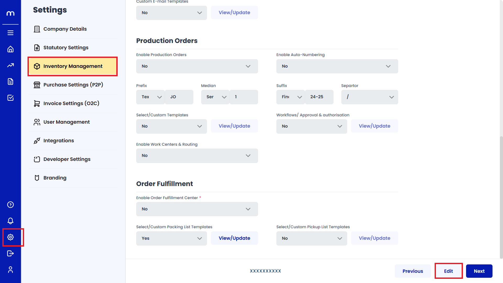 To enable Production Orders, go to Home > Settings > Inventory Management > Edit.