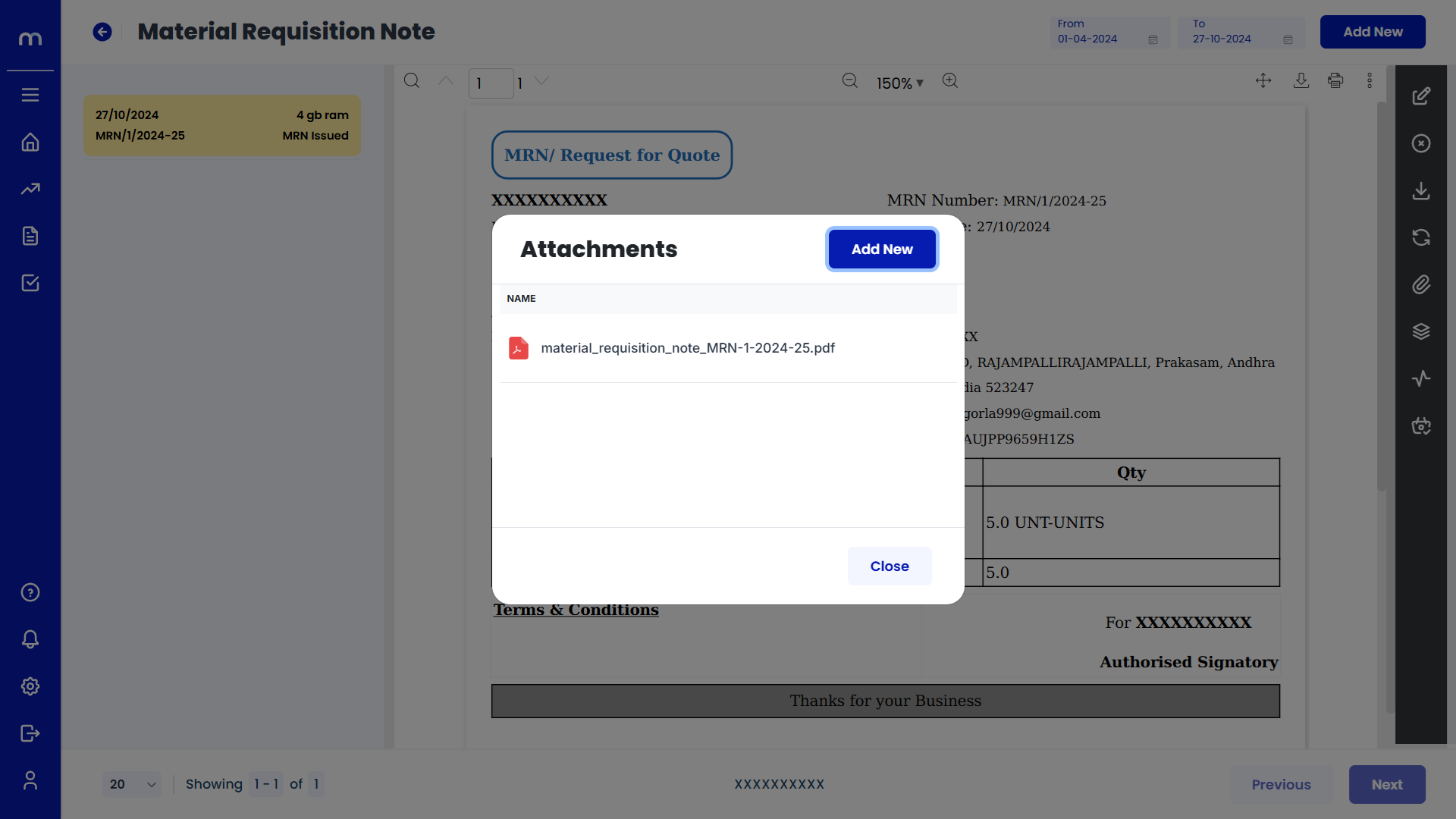 Material Requisition Note Template page will be displayed as fallows and Click on Attachments button.