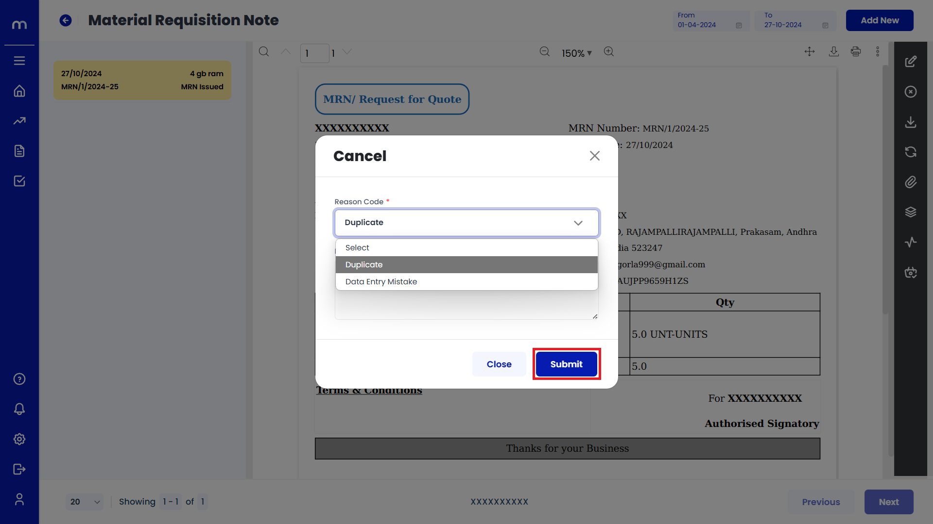 Cancel page will be displayed as Follows, Enter the Reason code and Remarks and click Submit button.