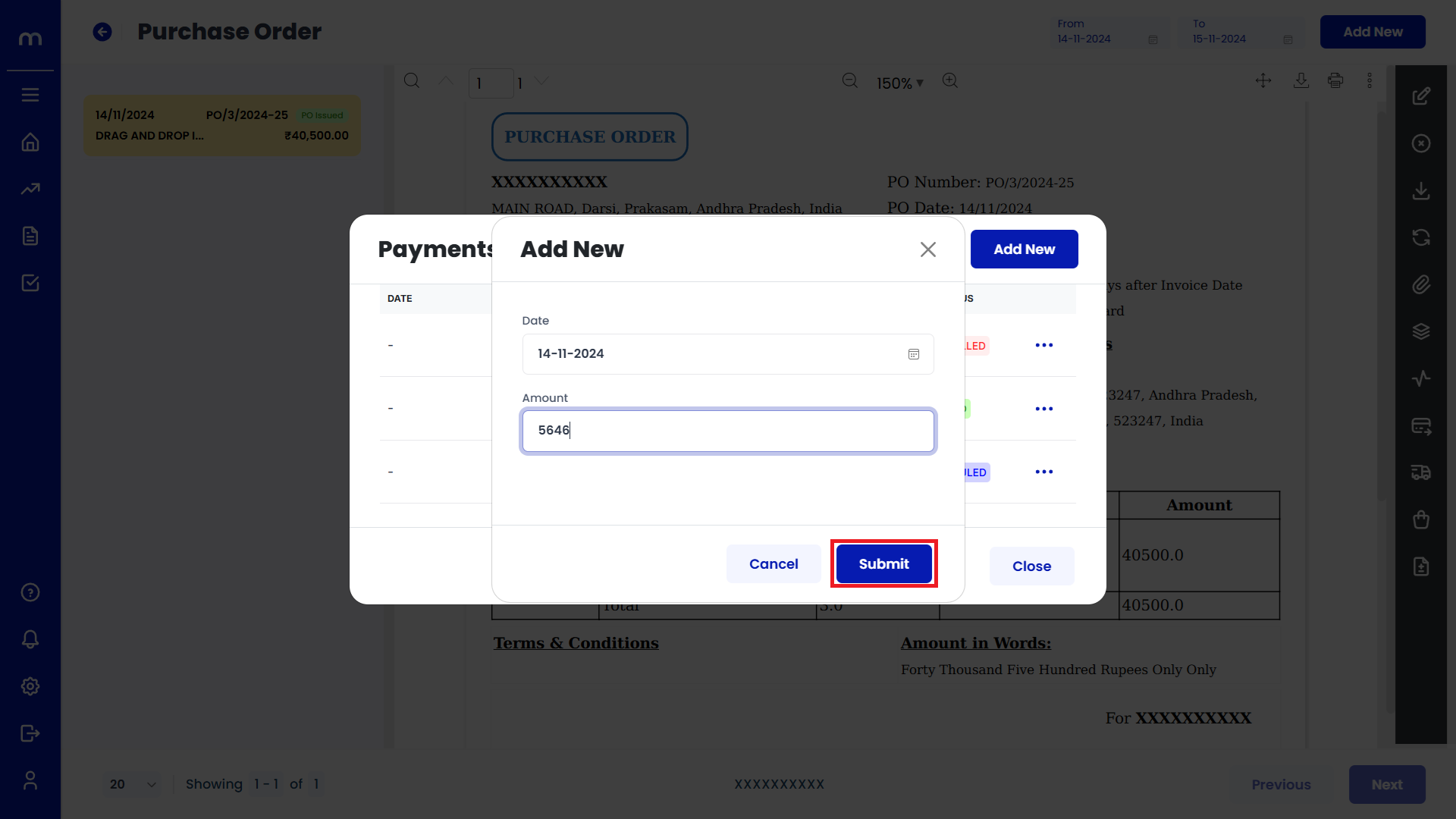 Purchase Order Template page will be displayed as fallows and Click on Payments button.