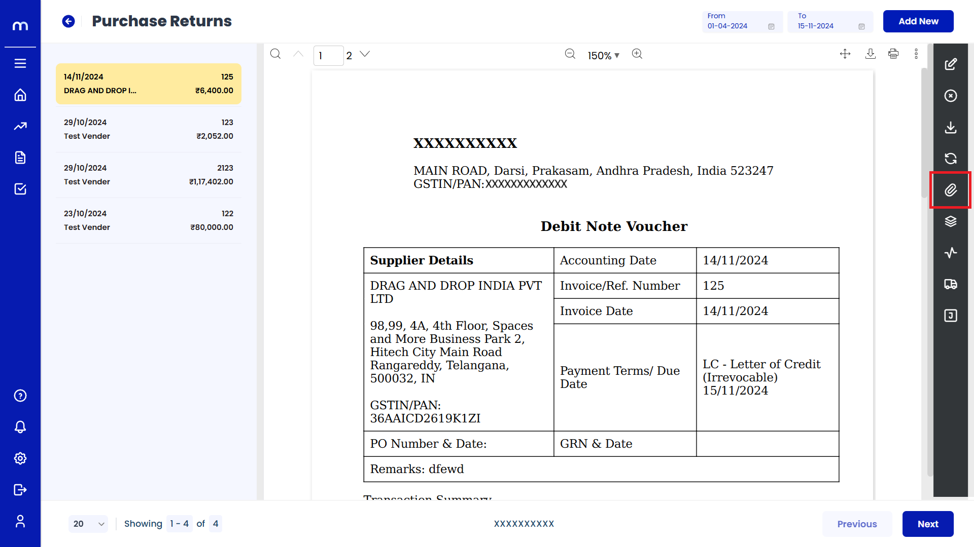 Purchase Returns Template page will be displayed as fallows and Click on Attachments button.