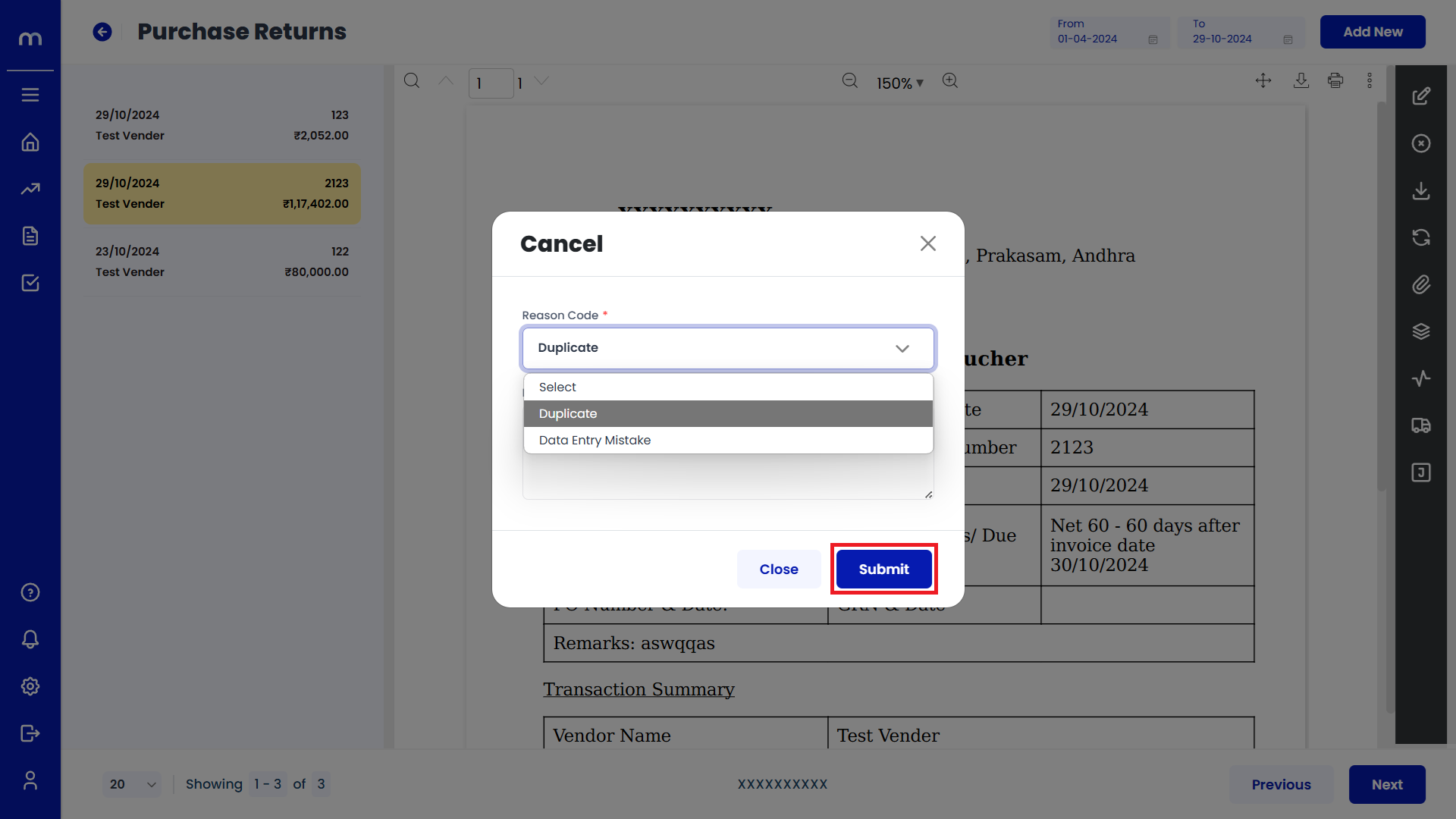 Cancel page will be displayed as Follows, Enter the Reason code and Remarks and click Submit button.