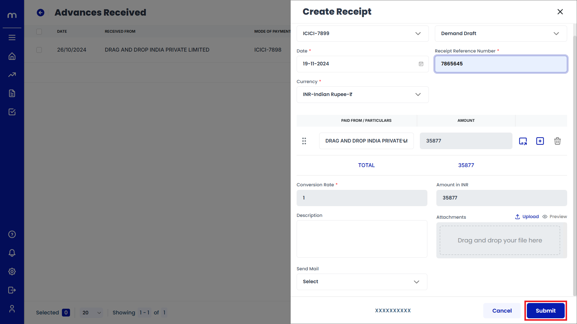 Create Receipt page will be displayed as Follows, Fill in required details and click on Submit button.